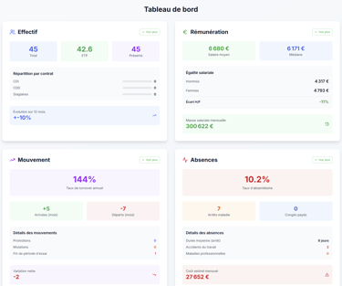 Nos calculs pré-établis garantissent des indicateurs fiables. Les données proviennent de vos outils, et notamment de la DSN.